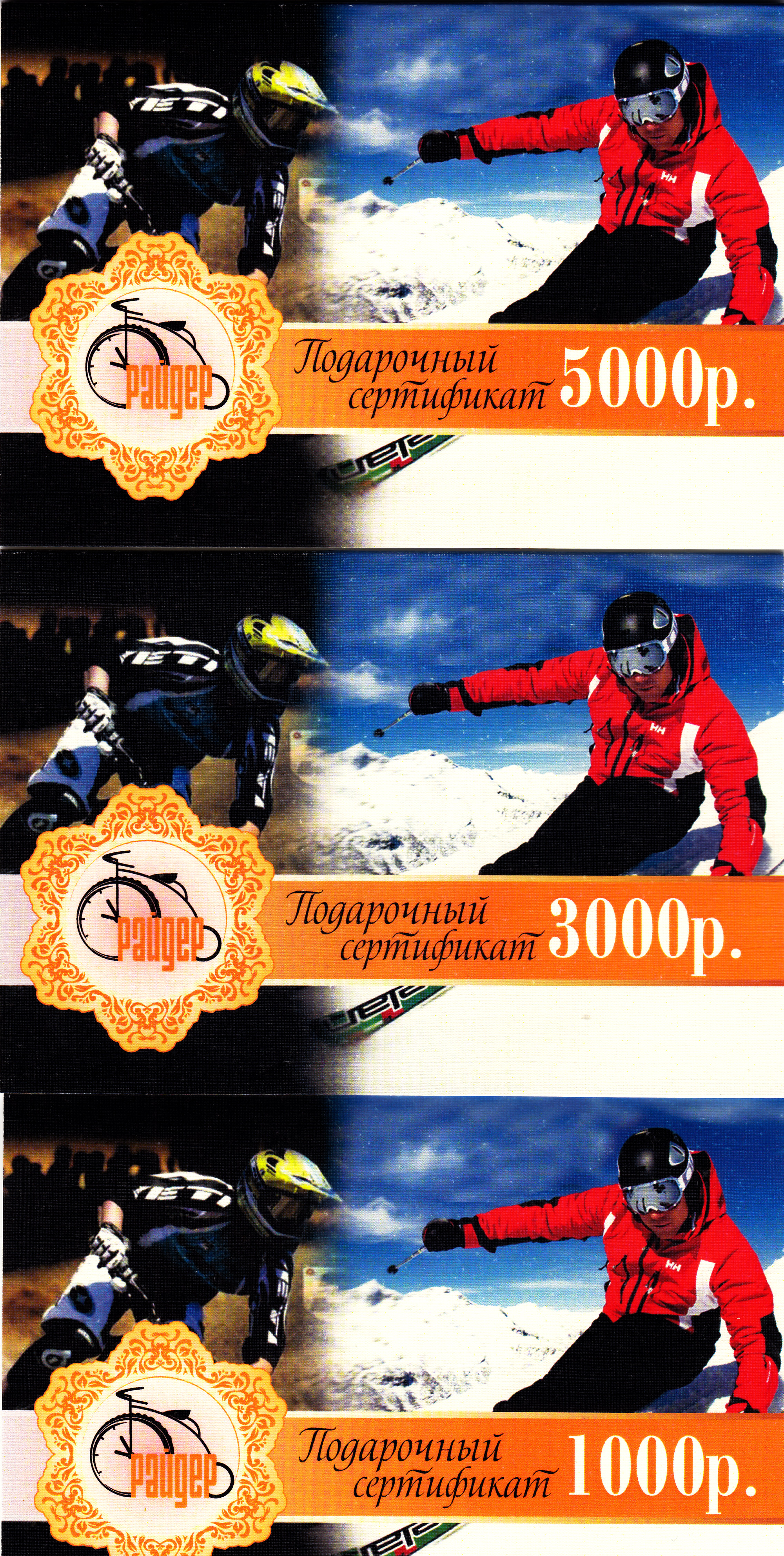 Не знаете что подарить начальнику, коллеге, близкому человеку ? Боитесь не угодить с подарком ? Мы предлагаем Вам универсальное решение — подарочные сертификаты магазина «Райдер» номиналом 1000, 3000 и 5000 рублей. Подарочный сертификат используется в качестве полной или частичной оплаты любого товара из ассортимента магазина! Получатель сертификата сам выбирает желанный и нужный подарок !