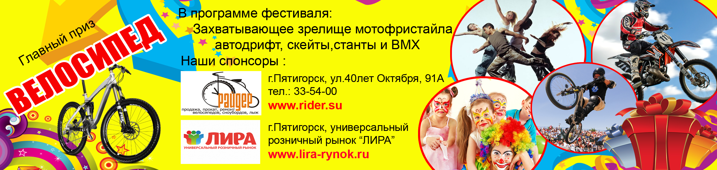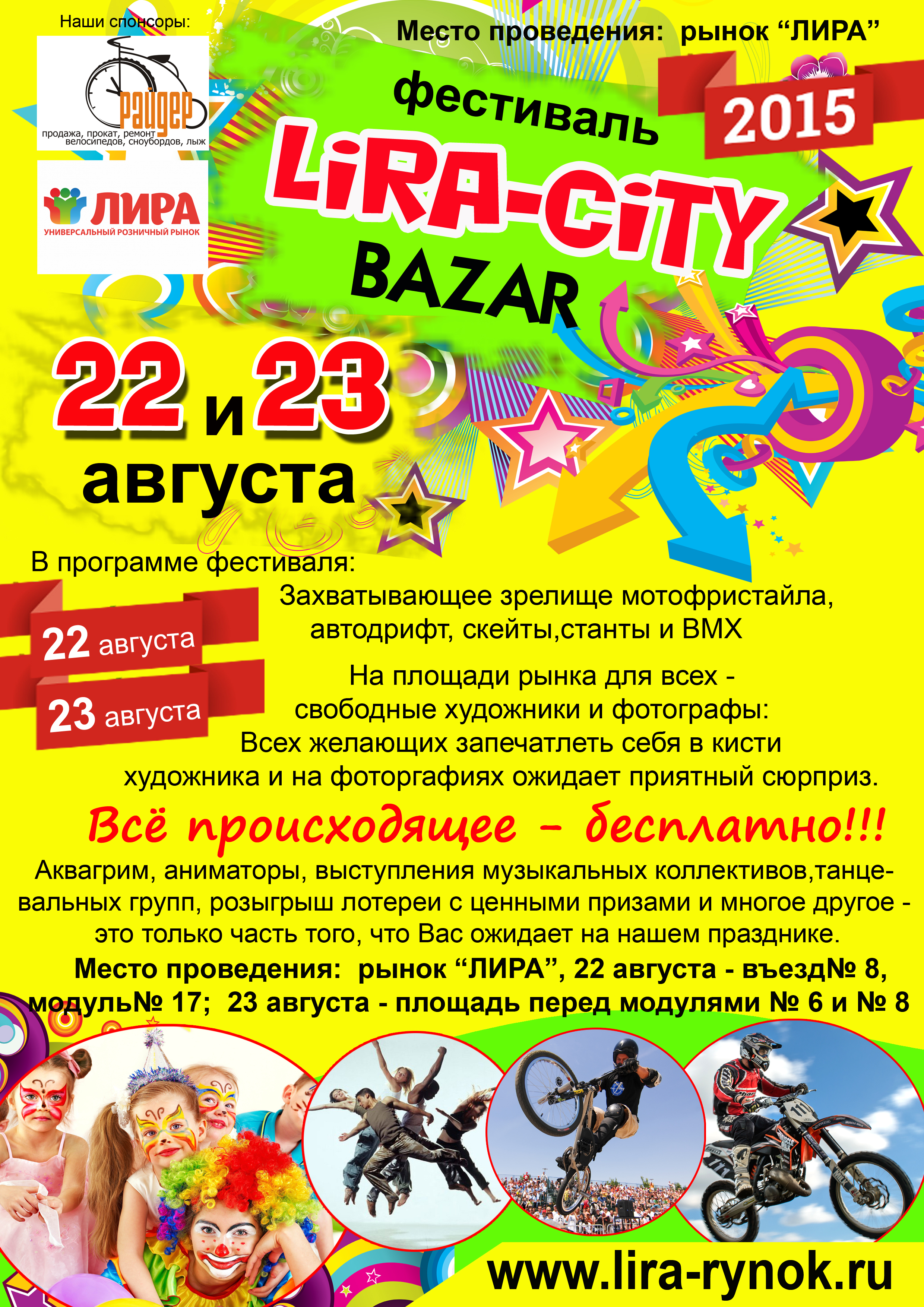 Приглашаем Всех желающих посмотреть на захватывающее зрелище — 22 августа 2015 г,в 11.00, при поддержке магазина «Райдер» и рынка «Лира» состоится фестиваль «LIRA-CITY BAZAR». В программе фестиваля запланированы выступления мотофристайлеров, автодрифтеров, скейтеров а также ВМХ и станты ! Среди всех желающих зрителей будет проведена бесплатная лотерея, на которой будут разыграны ценные призы и главный приз — велосипед ! Не упустите свой шанс отлично провести время !