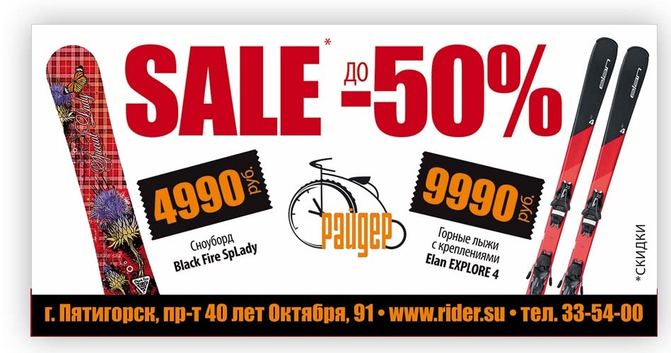 С радостью объявляем о долгожданной РАСПРОДАЖЕ горных лыж, сноубордов, а так же ботинок и креплений к ним ! Скидки от розничных цен достигают 50 % ! Так же, до 28 февраля, предоставляется скидка 25% на всю одежду, термобельё, перчатки, шапки, балаклавы, зимние шлемы и маски ! Сезон в самом разгаре, а у Вас есть замечательная возможность обновить своё оборудование по реально доступным, максимально низким ценам ! Торопитесь — количество ограничено !