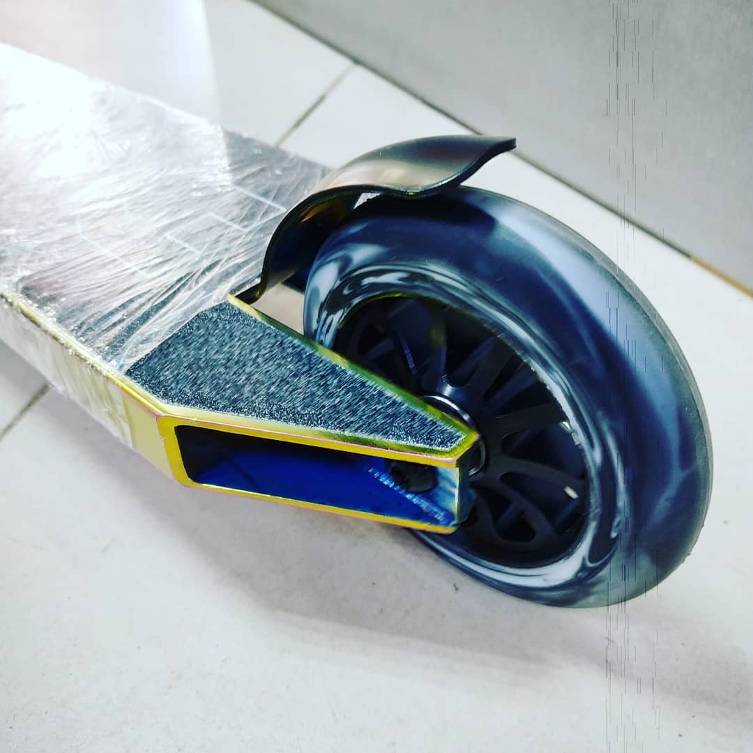 Для повышения комфорта езды, некоторые модели могут оснащаться аммортизаторами. Размер колёс варьируется в диапазоне 100-150 мм в диаметре, наиболее оптимальными по соотношению скорость/комфорт являются колёса, изготовленные из полиуретана. Чем больше размер колеса, тем большую скорость может развить самокат.